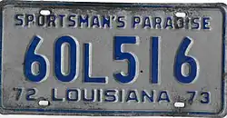 1972–73 | Embossed blue serial on reflective white plate with border line; "72 LOUISIANA 73" at bottom | "SPORTSMAN'S PARADISE" at top | 123A456 | Letter corresponds to State Police troop area of issue | |