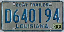 Boat Trailer | Embossed blue on white with border line; "LOUISIANA" at bottom; "BOAT TRAILER" at top | unknown | D123456 | Likely to have begun at D500000. |