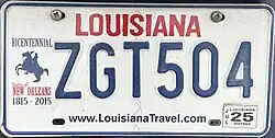 January 2014 – December 2015 | Embossed dark blue serial on reflective white plate with border line; logo of the Battle of New Orleans Bicentennial Commission (featuring a bucking horse and rider) screened at left; "LOUISIANA" screened in red centered at top | "www.louisianatravel.com" screened in dark blue centered at bottom | ABC123 | XSA000 to approximately ZPC999 | Limited-run plate to commemorate the 200th anniversary of the Battle of New Orleans. |