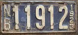 1911 | Black serial on white porcelain plate; vertical "1911" and "NB" at left and right respectively | none | 123 | 1 to 483[4] | Those who paid their license tax to the Provincial Board of Works in 1911 were provided with a 6 x 10 inch license plate.[5] |