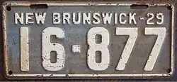 1929 | Embossed white serial on teal plate with border line; "NEW BRUNSWICK-29" at top | none | 12-345 | 5-000 to approximately 32-200 | |