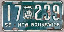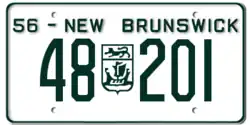 1955 | Embossed white serial on green plate with border line; embossed provincial shield used as separator; "55 – NEW BRUNSWICK" at bottom | none | 12-345 | 1-000 to approximately 79-000 | |