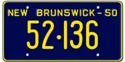 In 1956, Canada, the United States and Mexico came to an agreement with the American Association of Motor Vehicle Administrators, the Automobile Manufacturers Association and the National Safety Council that standardized the size for licence plates for vehicles (except those for motorcycles) at 6 inches (15 cm) in height by 12 inches (30 cm) in width, with standardized mounting holes.[3] The first New Brunswick licence plate that complied with these standards was issued seven years beforehand, in 1949 (dated 1950).