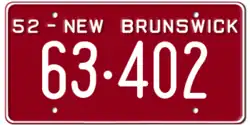 1952 | Embossed white serial on maroon plate with border line; "52 – NEW BRUNSWICK" at top | none | 12·345 | 1·000 to approximately 64·000 | |