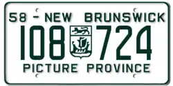 1958 | Embossed green serial on white plate with border line; embossed provincial shield used as separator; "58 – NEW BRUNSWICK" at top | "PICTURE PROVINCE" centred at bottom | 123-456 | 10-00 to approximately 109-000 | |