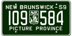 1959 | Embossed white serial on green plate with border line; embossed provincial shield used as separator; "NEW BRUNSWICK – 59" at top | "PICTURE PROVINCE" centred at bottom | 123-456 | 10-00 to approximately 110-000 | |