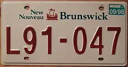 1991-2003 | Embossed red serial on reflective white plate; screened provincial wordmark (red galley graphic with "New" and "Nouveau" to the left and "Brunswick" to the right, all in green) centred at top | none | L12-345 | ||