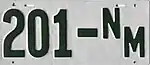 1925 Embossed white serial on black plate with border line; "N.M. 1925" centered at bottom; vertical "FRONT" or "REAR" at left none 12345 1 to approximately 47000 Issued in pairs, for the front and the rear of the vehicle respectively.