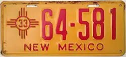 1933 Embossed red serial on golden yellow plate; embossed Zia sun symbol at left with "33" in the center; "NEW MEXICO" centered at bottom none 12-345 1 to approximately 65-000