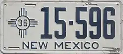 1936 Embossed dark blue serial on white plate; embossed Zia sun symbol at left with "36" in the center; "NEW MEXICO" centered at bottom none 12-345 1 to approximately 86-000