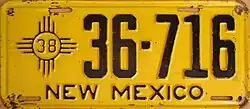 1938 Embossed black serial on yellow plate; embossed Zia sun symbol at left with "38" in the center; "NEW MEXICO" centered at bottom none 12-345 1 to approximately 92-000
