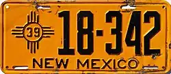 1939 Embossed black serial on orange plate; embossed Zia sun symbol at left with "39" in the center; "NEW MEXICO" centered at bottom none 12-345 1 to approximately 93-000