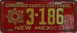 1940 Embossed yellow serial on red plate; embossed Zia sun symbol at left with "1540" above and "1940" below; "NEW MEXICO" centered at bottom "CORONADO CUARTO CENTENNIAL" at top 12-345 1 to approximately 96-000 Commemorated the 400th anniversary of the expedition of Francisco Vázquez de Coronado.
