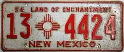 1954 Embossed red serial with Zia sun symbol separator on white plate with border line; "NEW MEXICO" centered at bottom; "54" at top left "LAND OF ENCHANTMENT" at top, offset to right 1-12345