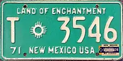 1971–74 Embossed white serial with Zia sun symbol separator on reflective pale green plate with border line; "NEW MEXICO USA" at bottom "LAND OF ENCHANTMENT" at top 1-12345