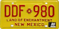 Embossed red serial with Zia sun symbol separator on yellow plate; "New Mexico" screened in red centered below serial; stamped indentation at top center for county-name sticker "Land of Enchantment" screened in red centered at bottom ABC-123 EHA-001 to KAJ-999 'F' series not used.[2]