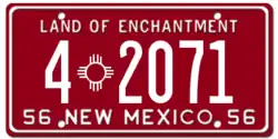 In 1956, the United States, Canada and Mexico came to an agreement with the American Association of Motor Vehicle Administrators, the Automobile Manufacturers Association and the National Safety Council that standardized the size for license plates for vehicles (except those for motorcycles) at 6 inches (15 cm) in height by 12 inches (30 cm) in width, with standardized mounting holes.[1] The 1955 (dated 1956) issue was the first New Mexico license plate that complied with these standards.