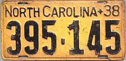 1938 | Embossed black serial on yellow plate; "NORTH CAROLINA–38" at top | none | 123-456 | 200-001 to approximately 646-000 | |