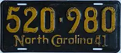 1941 | Embossed golden yellow serial on black plate; "North Carolina 41" centered at bottom | none | 123-456 | 200-001 to approximately 775-000 | |