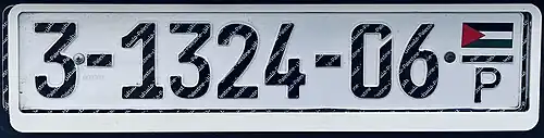 Generally, registration plates in the West Bank have the Latin letter "P" for Palestine or Palestinian Authority on the strip in the right side; above that, the Arabic letter ف (Faa') for فلسطين (Falasteen) or السلطة الفلسطينية (a-Sultat al-Filastiniya).