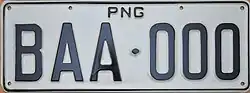 In about 1993, Papua New Guinea began using a letter system to denote the Province of registration. General issue type issued in the National Capital District (NCD), as denoted by the B prefix. Manufacturing variations exist. BAA-000 to BAK-000 were manufactured by Altona Industries and made of steel. BAL-000 onwards were made of aluminium. |