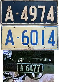 General issue type issued in the Territory of New Guinea. Believed to have been introduced in 1920. Period photos show many were made from kits. These kits consisted of a pre-drilled black painted steel plate with clip on aluminium numbers, consistent with the type of plate kit used in Queensland at the time. Others are of similar style to New South Wales registration plates of the same period. | ![]() |