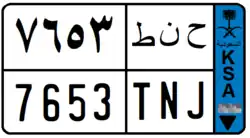![]() Current regular legal standard number plate from Saudi Arabia. | |