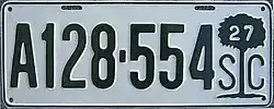 1927 Embossed green serial on white plate with border line; "SC" at right, with letters separated by embossed Sabal palmetto containing debossed "27" none A123-456 Letter corresponds to weight class