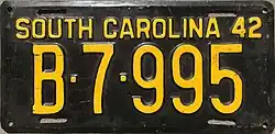 1942–44 Embossed black serial on golden yellow plate; "SOUTH CAROLINA 43" at bottom none A·12·345 Letter corresponds to weight class Revalidated for 1944 with green tabs, due to metal conservation for World War II.