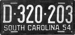 1954 Embossed white serial on black plate; "SOUTH CAROLINA 54" at bottom none A·123·456 Letter corresponds to weight class
