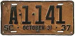 1939–40 Embossed golden yellow serial on black plate; "SC · OCTOBER 31 · 40" at bottom none A·12·345 Letter corresponds to weight class