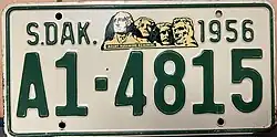 1956 | Embossed green on beige with border line; "S.DAK.", Mount Rushmore decal and "1956" at top | none | 1-12345 10-1234 |
