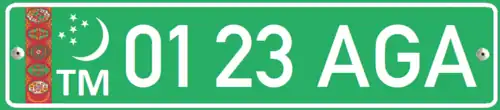 Government plates are green with silver characters arranged in the following format: ## ## XXX – where # is any digit between 0 and 9, and X is a letter from the Latin alphabet. An example of a governmental plate issued in the capital, Ashkhabad, would look like this: 00 33 AGA. Unusually, all the characters are rendered in the typeface formerly used on French registration plates.[2]