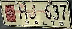 In the case of Salto, an alphanumeric system of 3 letters and 3 numbers was adopted, with the shield of the department larger than other departments in the center of the license plate. In 2015, the Mercosur patent was implemented with 3 letters and 4 numbers starting from HAA 1000.