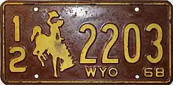 1968 | Embossed yellow serial and Bucking Horse and Rider on brown plate with border line; "WYO 68" at bottom right | 1-1234 1-123A 1-A123 1/0-1234 1/0-123A |