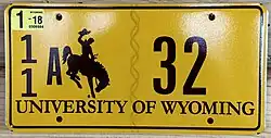 University of Wyoming | Screened brown on gold; "UNIVERSITY OF WYOMING" at bottom | 1-1234 1/0-1234 Coded by county of issuance (1 or 1/0) |