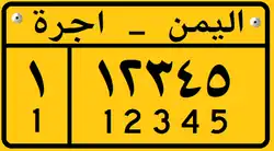 Vehicle registration plates of Yemen entered regular usage in 1993. The current version started in 2018 used FE-Schrift typeface for alphanumeric and Square Kufic typeface for Arabic text.[1]