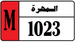 Al Mahrah Governorate License Plates consist of black text and black boundary on white background. Hadramaout Governorate plates consist of the governorate name in Arabic (المهرة) and a 4 digit number. Al-Mahrah Governorate plates also have a strip on the left hand side with the letter M in black on a background whose color depends on the classification of the vehicle. Similar to Hadramout, The license plates for Al-Mahrah use a unique serif font.[5]