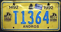 1992-1996 | Blue on yellow | 1492 FIRST LANDFALL 1992 | T1234 | Anniversary of Christopher Columbus's arrival in the Americas on October 12, 1492 (truck plate) | |