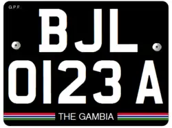 Rear Plate: 27x20 cm Black on yellow Bottom strip in Gambian Flag Text in the center bottom, saying The Gambia |