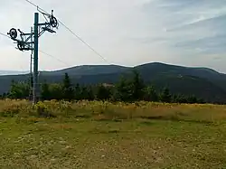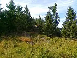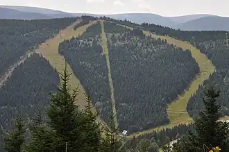 All types of forestation can be found here: spruce forest, mixed forest,[b] and deciduous forest, with spruce forest predominating.[6] The northern and southwestern slopes feature mixed forests alongside the spruce forest, and as altitude decreases on the southwestern slope, deciduous forests also appear. Nearly all slopes show significant variability in forest coverage, with clearings, ski trails, associated ski lifts, and large meadows.[7] Along the southwestern slope near the Koutský žleb couloir, runs a 22 kV overhead power line. Approximately 750 meters west of the summit, near the crest of the southwestern slope, there are isolated rocky outcrops and a group of rocks at elevations from 1,050 to 1,080 meters above sea level.[3]