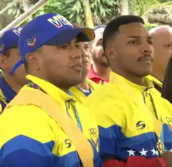 The flagbearers for Venezuela were chosen by popular vote, with one male and one female representative to be flagbearers: karateka Antonio Díaz and triple jumper Yulimar Rojas were selected.[26] The voting program, called "Abanderado por el Pueblo" ("The People's Flagbearers"), was devised by the COV in May 2021.[27] On 22 July 2021, the day before the opening ceremony, Rojas was still slated to be a flagbearer,[28] but she did not appear at the ceremony.[29] Judoka Karen León walked alongside Díaz at the opening ceremony, but did not carry the flag.[30][1] Díaz was the only karateka flagbearer, and both he and Antonio Espinós, president of the World Karate Federation (WKF), felt proud to have a representative for the sport featured in the opening ceremony,[26] with Espinós saying that the WKF "couldn't have asked for a better ambassador for karate".[1]