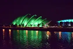 The Scottish Exhibition and Conference Centre, located in the West End of the city, hosted the Wrestling, Judo and Boxing, as well as the Main Press Centre and the International Broadcast Centre, benefiting from its strategic position adjacent to the headquarters of BBC Scotland and STV at Pacific Quay. The Clyde Auditorium hosted Weightlifting, whilst the new SSE Hydro was used for the Gymnastics and Netball events.[10] Kelvingrove Park, also in the city's West End, was the venue for Bowls and has five bowling greens installed for competitive use. A comprehensive upgrade and refurbishment of the park was completed ahead of the Games.[11] Scotstoun Leisure Centre hosted Table tennis and Squash.[12]