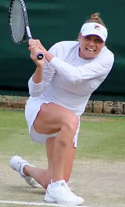 Beginning the grass-court season at Eastbourne as the top seed, Zvonareva defeated Heather Watson, 6–3, 6–3, and Serena Williams, 3–6, 7–6, 7–5, but lost to Samantha Stosur, in three sets in the quarterfinals.[13] Zvonareva was second seed at Wimbledon, defeating Alison Riske, 6–0, 3–6, 6–3, in the first round and Elena Vesnina, 6–1, 7–6, in the second, before falling to Tsvetana Pironkova, in straight sets in a rematch of the previous year's semifinal match.[14] Zvonareva suffered an ankle injury during her singles match and subsequently withdrew from the doubles competition.[15]