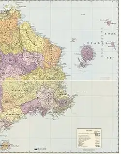 A Political Map of Eastern Viti Levu and adjacent islands, this image is the right half of an old Fiji Government map printed initially in 1953 by the Fiji Lands Department entitled "Viti Levu and Adjacent Islands - Colony of Fiji"