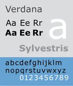Bearing similarities to humanist sans-serif typefaces such as Frutiger, Verdana was designed to be readable at small sizes on the low-resolution computer screens of the period.[4] Like many designs of this type, Verdana has a large x-height (tall lower-case characters), with wider proportions and looser letter-spacing than on print-orientated designs like Helvetica. The counters and apertures are wide, to keep strokes clearly separate from one another, and similarly shaped letters are designed to appear clearly different to increase legibility for body text. The bold weight is thicker than would be normal with fonts for print use, suiting the limitations of onscreen display.[5] Carter has described spacing as an area he particularly worked on during the design process.[6]