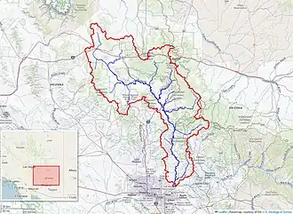 The river begins below the dam at Sullivan Lake, fed by Big Chino Wash and Williamson Valley Wash in Yavapai County. The Verde flows freely for 125 miles (201 km) through private, state, tribal and United States Forest Service lands,[5] specifically the Prescott National Forest, Coconino National Forest and Tonto National Forest, before encountering the first of two dams that make Horseshoe Lake and Bartlett Lake.[4] The cities of Camp Verde, Clarkdale and Cottonwood are the main population centers along the river.[4] The Verde River and the Salt River converge on the Salt River Pima-Maricopa Indian Community. The Salt River flows into the Gila River west of Phoenix.