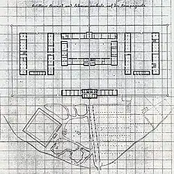 The military engineering offices, headed by Lieutenant Colonel Conrad Petrasch, produced an initial plan of the arsenal in 1854, probably taking as a reference the arsenal in Vienna, built between 1848 and 1859 and thus slightly preceding the one in Verona. The design reflected the typical structure of the nineteenth-century artillery arsenal, organized into several bodies of buildings arranged symmetrically in functional courts, according to the logical sequence of construction, maintenance, storage, and storage operations for heavy and light weapons. The original plan envisioned a complex of imposing size, laid out over an area of 11-13 hectares on which 16 bodies of buildings were to be built, with a wall that would divide the complex into two sectors of similar size: the southern sector, facing the city, would be for the artillery in use in the stronghold, while the northern sector would be for country (or war) artillery.[5]