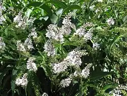 Veronica derwentiana is a woody herb which grows to 140 cm (55 in) high with numerous upright stems from a woody rootstock. The stems are smooth or have small hairs lying longitudinal, occasionally on the whole surface and not branched below the flowers. The stems remain for up to 2 years. The leaves are 5–20 cm (2.0–7.9 in) long, lance to egg-shaped and ending in a sharp point or tapering to a point. The leaves vary at the base and may be wedge, squared, or heart shaped on a small broad stalk or without a stalk. The leaf margin has 30-80 small pointed teeth. The calyx lobes are 2–5 mm (0.079–0.197 in) long, either smooth or with occasional short hairs. The flower petals are 5–9 mm (0.20–0.35 in) long, white, pale lilac or pale blue in racemes of 40-100 flowers. The seed capsule is narrow or broadly egg-shaped, 2.8–5.5 mm (0.11–0.22 in) long, 2.5–4.5 mm (0.098–0.177 in) wide and either smooth or with short hairs on the upper side and somewhat lustrous. Flowering occurs in summer.[3][4][5]