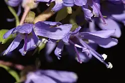 Veronica missurica (syn. Synthyris missurica) is a species of flowering plant in the family Plantaginaceae known by the common names tailed kittentails,[2] mountain kittentails, or Columbia kittentails. It is native to the Pacific Northwest of the United States, where it grows in moist areas in forests and other mountain and foothill habitat types. It is often one of the first wildflowers to bloom in its mountain habitat, sometimes coming up before the snow is melted.[3] It is a rhizomatous perennial herb with a rosette of basal leaves with toothed, rounded blades borne on petioles. The inflorescence is a raceme of bright violet-blue flowers, each about half a centimeter long with two protruding stamens.